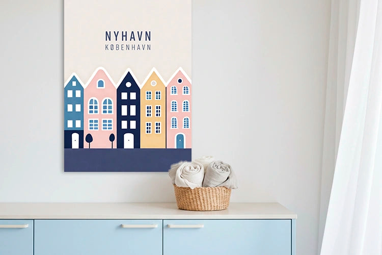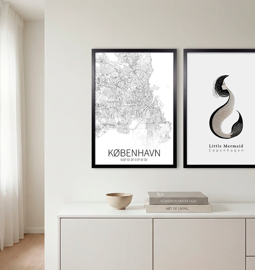 Manche Motive sind so stark dass sie als Illustration funktionieren – reduziert auf Form und Farbe, gerade weil jeder sie kennt. Der Nyhavn mit seinen bunten Giebeln, die kleine Meerjungfrau am Hafen. Grafisch interpretiert passen diese Motive zu einer Einrichtung die skandinavisches Design schätzt – klar, ohne Schnörkel, mit sofortigem Wiedererkennungswert.