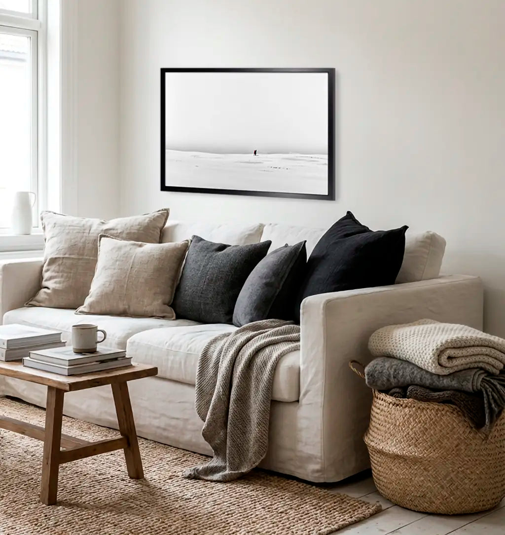 Und das ist kein Zufall. Weil Schwarz-Weiß keine Farbe in den Raum bringt, konkurriert es nicht mit anderen Farben. Es fügt sich in eine warme Holzeinrichtung genauso ein wie in ein reduziertes, helles Interior. Im Schlafzimmer wirken die ruhigen Küstenmotive besonders still. Im Home Office setzen die grafischen Leuchttürme und Hafenmotive klare Akzente. Und im Flur funktioniert eine kleine Serie oft viel besser als ein großes Farbmotiv – weil sie Rhythmus gibt, ohne zu "geschwätziig" zu sein. Wenn du Schwarz-Weiß mit Farbmotiven kombinieren willst: Gedeckte Sand-, Grau- und Blautöne halten die Ruhe aufrecht.