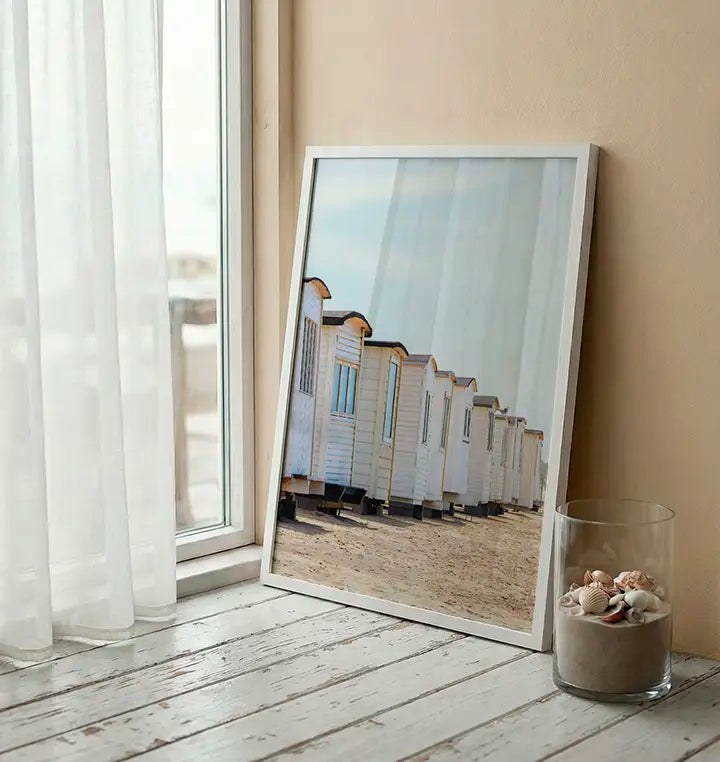 Strandbilder von der nordjütländischen Küste – weitläufige Strände, Strandgras, Badehäuser und Wellenbrecher, fotografiert und illustriert von Thomas Kaminsky. In Deutschland gedruckt als Poster, Fine-Art-Print auf Hahnemühle-Baumwollpapier oder Leinwand.